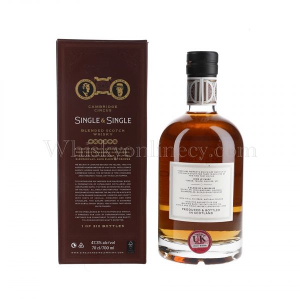 A bottle of Cambridge Circus 32 Year Old, a blend of six single malt whiskies from Macallan, Highland Park, Dalmore, Glenfarclas, Glen Elgin and Tormore, bottled at cask strength by Single & Single.