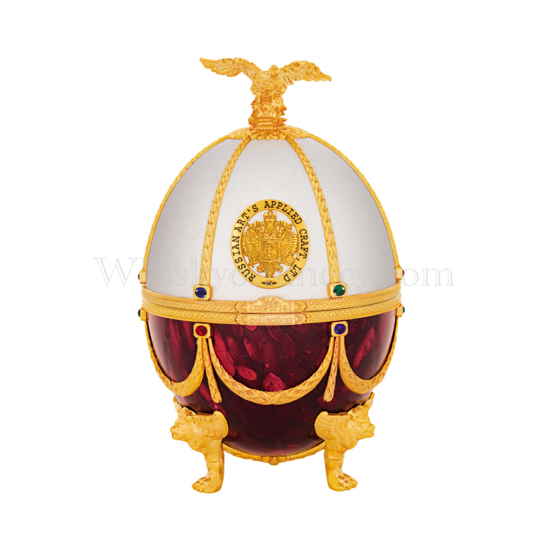A Pearl Fabergé style egg, decorated with crystal and gold detail, and topped with a gold eagle. Inside the egg is a decanter containing super premium vodka, distilled from wheat and rye with water from Lake Ladoga, and four small glasses with gold and enamel decoration.
